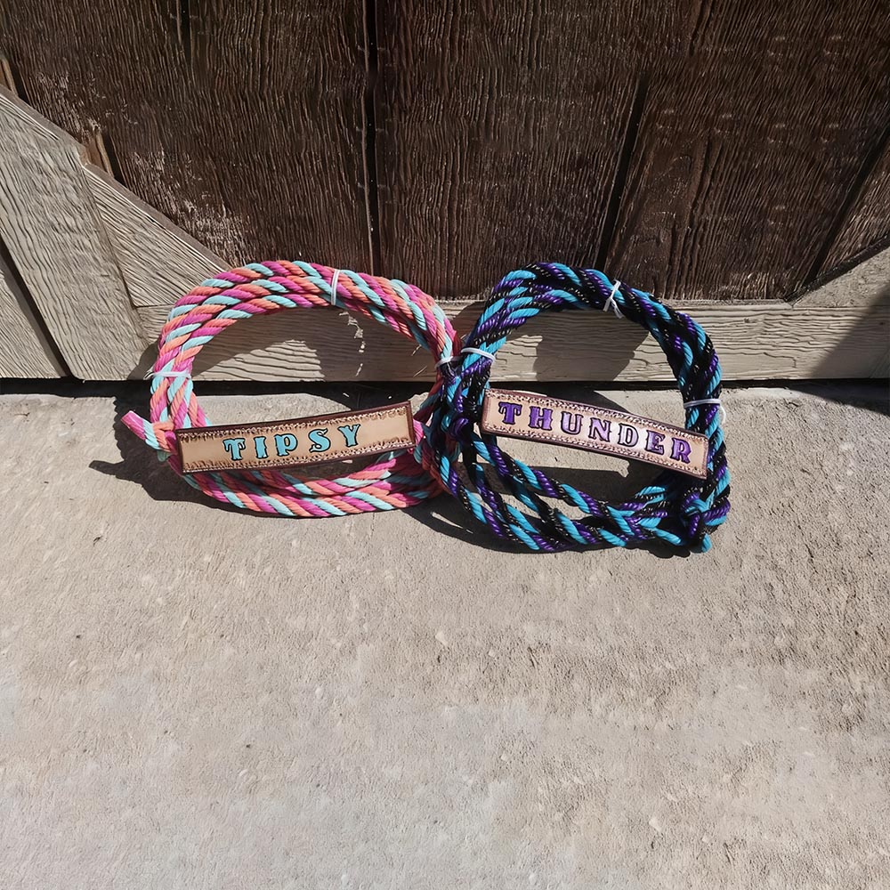 Unique Farm Accessory - This Personalized Name Tooled Cattle Halter is the perfect blend of functionality and personalization. Designed for calves, it features a colorful braided rope lead that adds a vibrant touch to any farm setting.