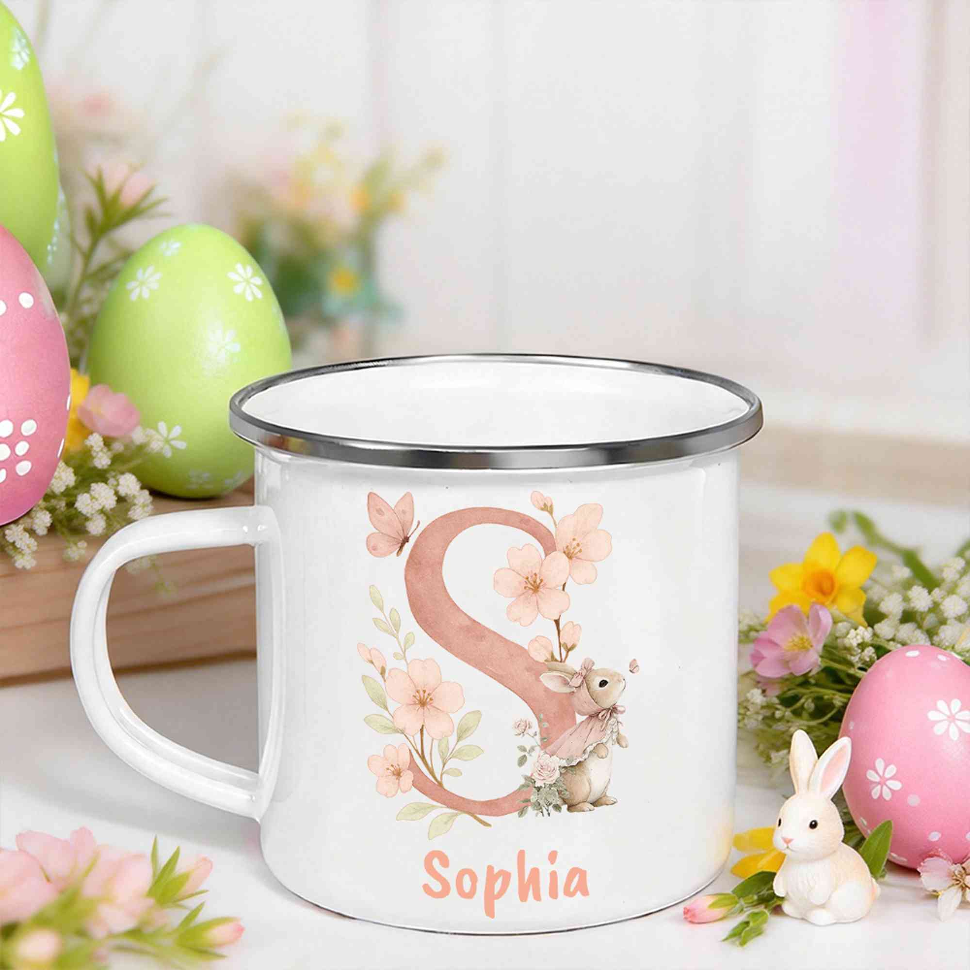 Bunny Alphabet Artwork - This enamel mug features a sweet Easter bunny paired with a floral alphabet initial in a soft watercolor style. The gentle rabbit artwork and pastel flowers create a cheerful Easter decoration that feels playful and warm for children.