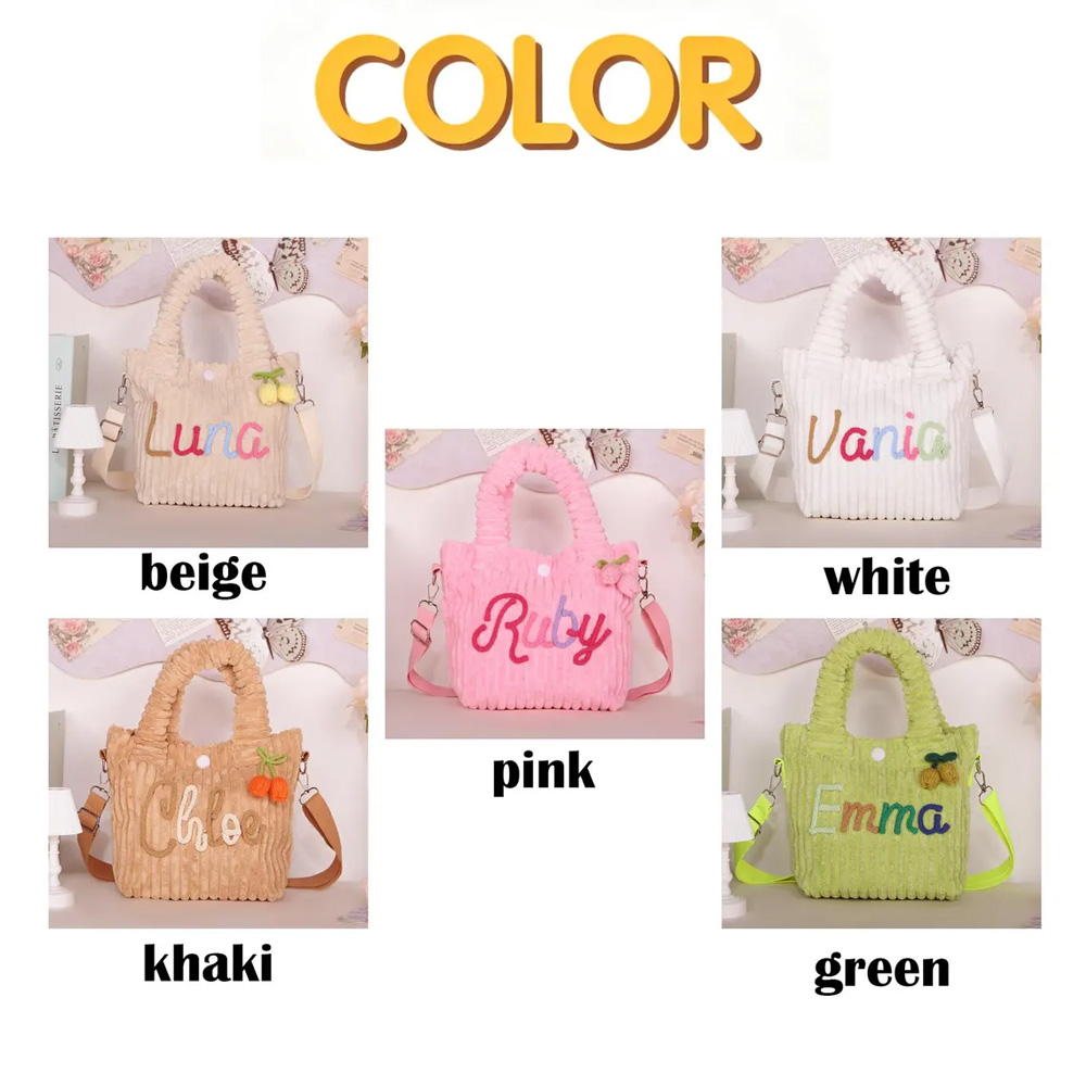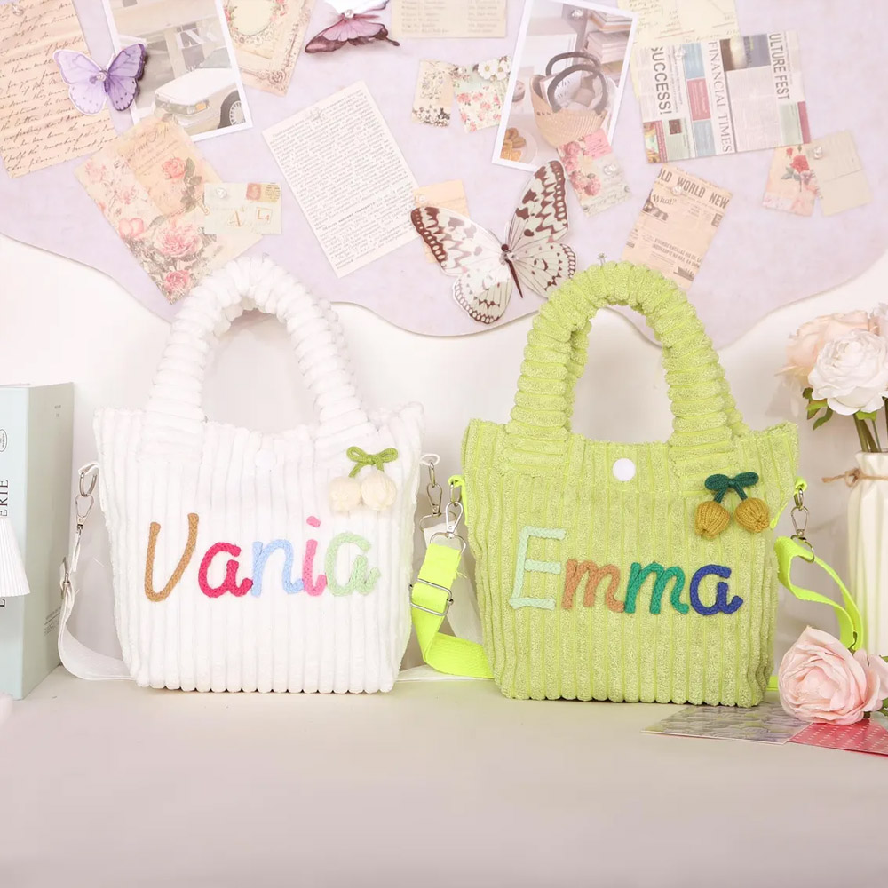 • Personalized Name Yarn Kid's Crossbody Corduroy Handbag with Tulip, Adjustable Strap Shoulder Bag, Back to School/Birthday Gift for Toddlers/Girls