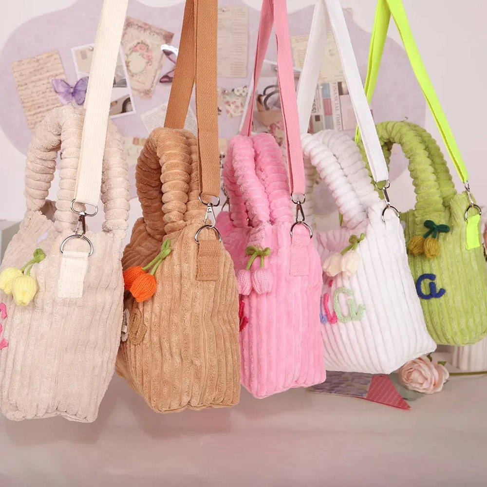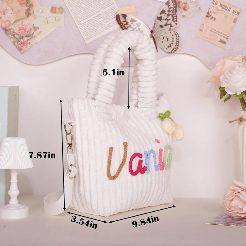 Personalized Name Yarn Kid's Crossbody Corduroy Handbag with Tulip, Adjustable Strap Shoulder Bag, Back to School/Birthday Gift for Toddlers/Girls