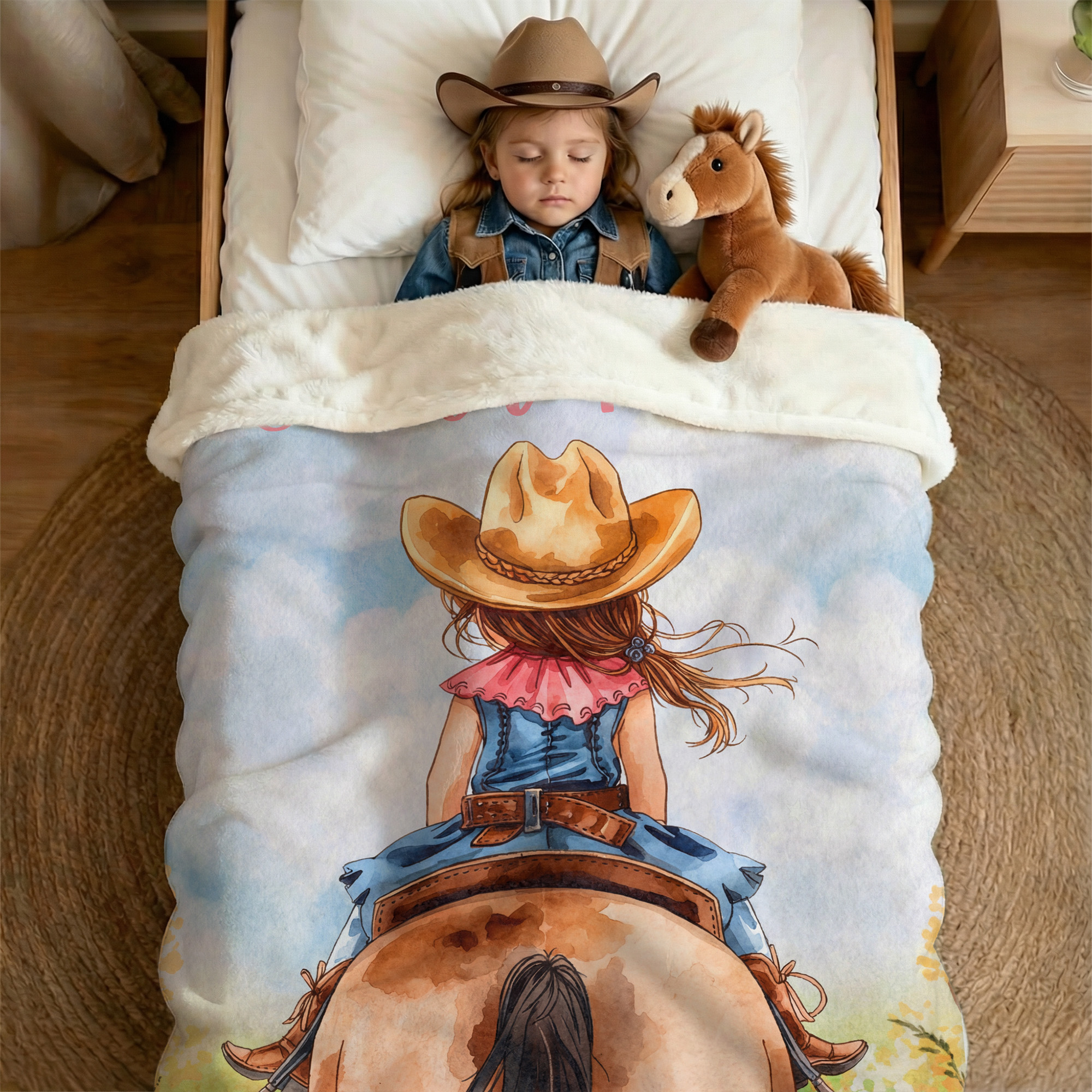 Watercolor Western Charm - The blanket features a cute little cowboy or cowgirl riding a horse illustration in a soft watercolor style, paired with rustic ranch elements that bring a warm Western feel to any kids’ bedroom or living room. The gentle colors and playful design suit both boys and girls who love rodeo themes.